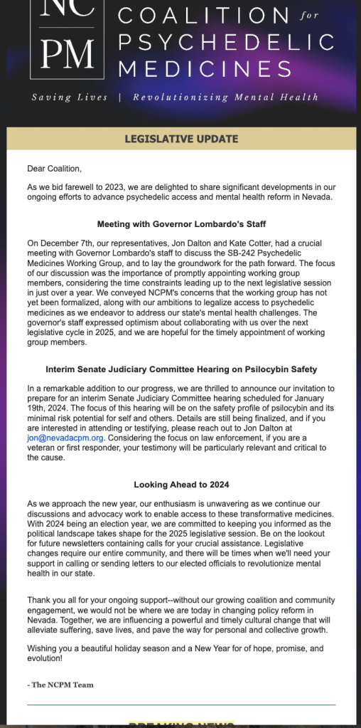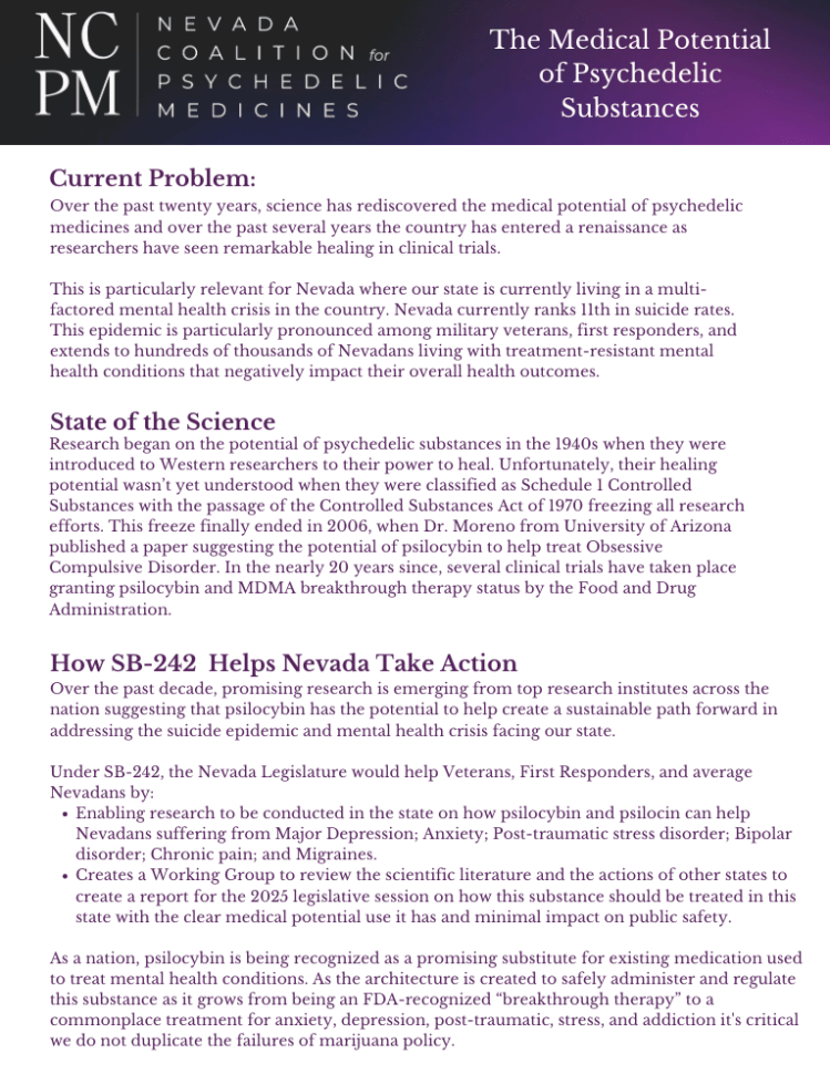 SB-242 passed with a 16-4 vote in the NV Senate; and 40-0 vote in the assembly creating the Psychedelic Medicines Working Group who will publish a report in November 2024.